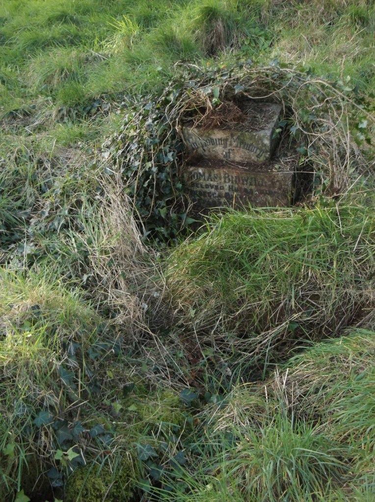 I eventually found the Thomas Bidwill grave which was completely covered in grass and ivy.  The only sign a of grave was a slight ivy-covered mound.  Pulling back the ivy revealed Thoma Bidwill’s headstone.