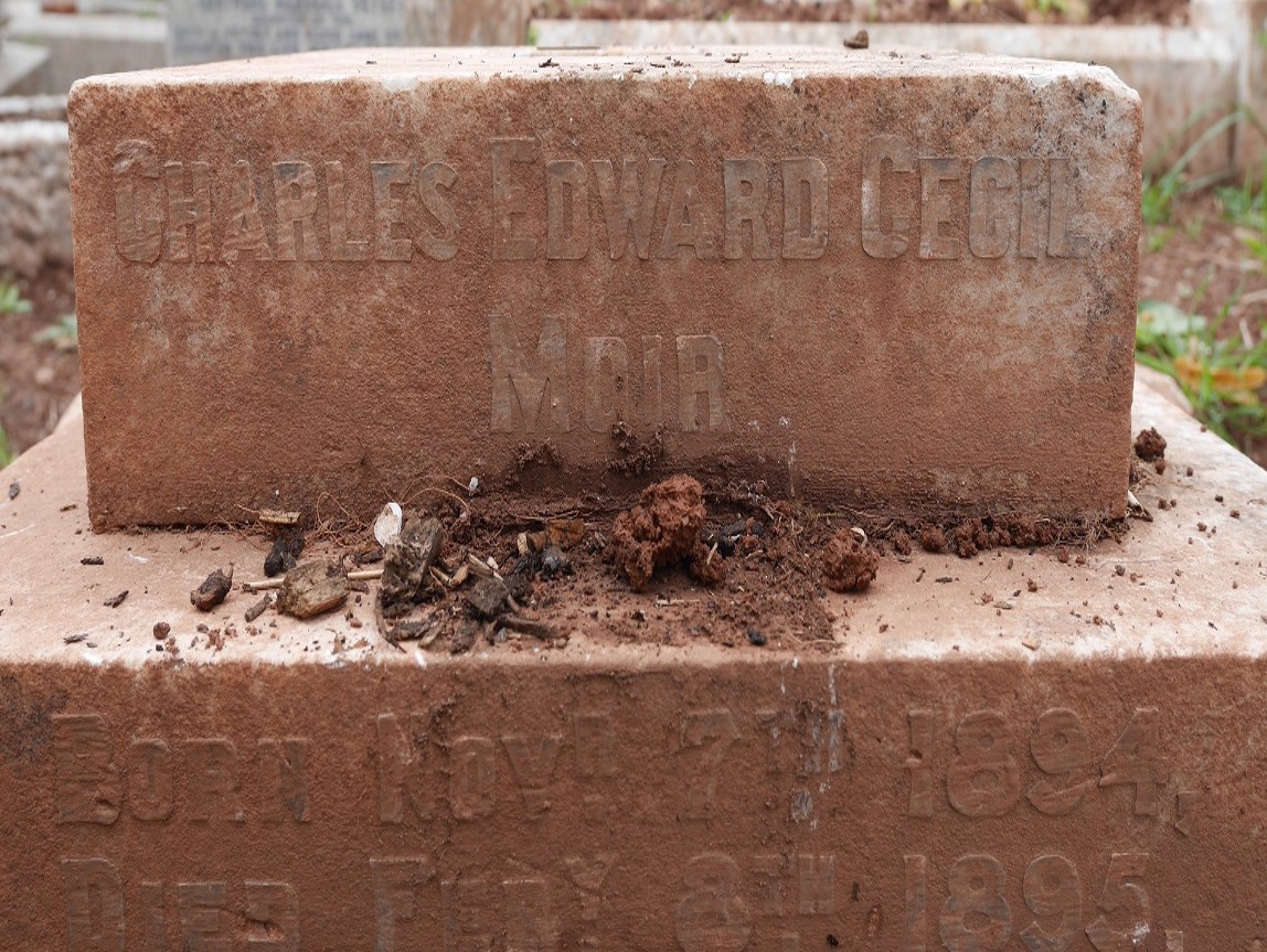 The area of the cemetery that we decided to clear first brought an unexpected finding – a row of children’s graves. We believe there are six, although only five have kerbstones which suggests that the sixth is an unmarked grave.