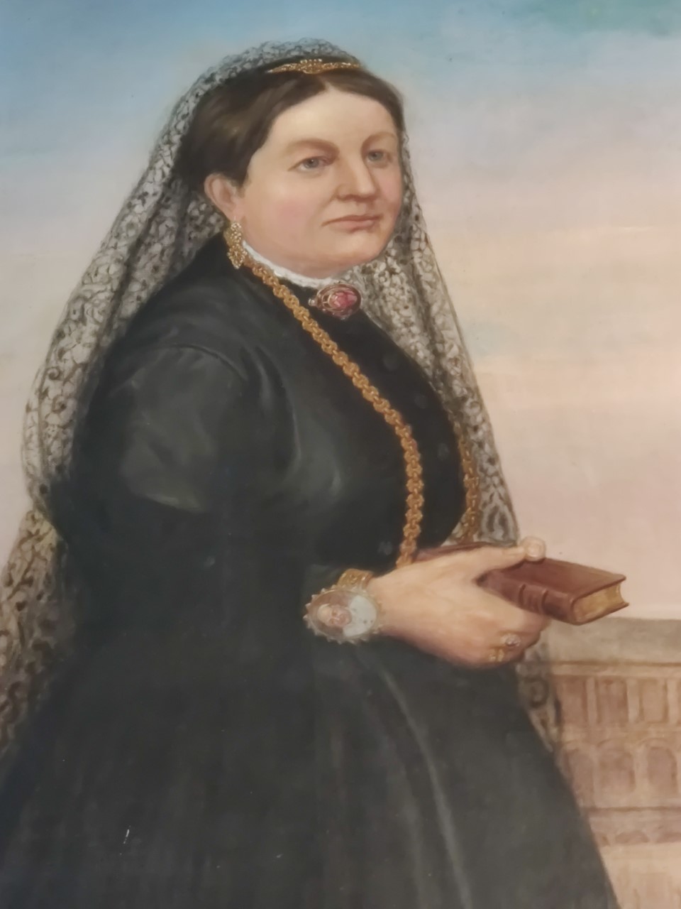 “A very large portrait of her, miraculously undamaged by the recent fire, still hangs in the hall of the Mansion. Magnificently bejewelled and dressed in a long black gown and black lace mantilla, a bracelet on her wrist with a painting of the Pope, and holding a prayer book, she stands in pious splendour against a background of St. Peter’s, Rome.”