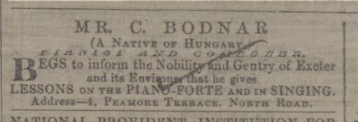 “It will be perceived from an advertisement in another part of our paper, that Mr C. Bodnar has commenced giving lessons in Music, &c, in this city and neighbourhood.  This gentleman who is an Hungarian, and honorary member of the Academy of Music at Vienna, is the author of several popular works.”