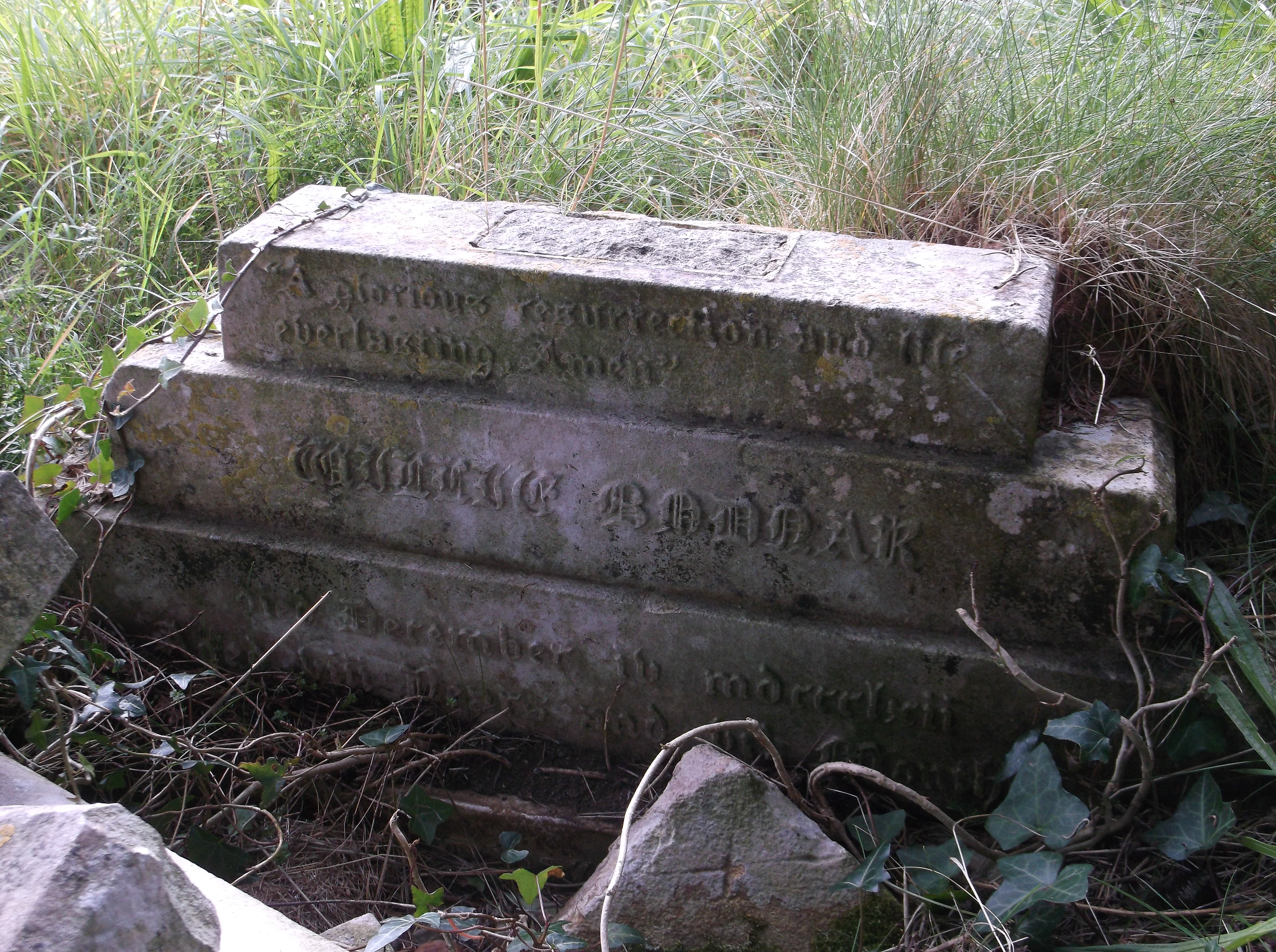 The earliest picture we have of the cemetery is a lithograph from 1864, eight years after the cemetery was opened. There is obviously some artistic licence in these pictures but you have to believe that the artist was trying to be as true to life as possible. One grave stood out to me and I wondered whether it had survived intact to the present day. So I went in search.  The grave was marked by a white cross atop a base of three square white stones laid in a pyramid fashion. I found it. The ‘pyramid’ was intact but the cross had broken and was lying to one side.