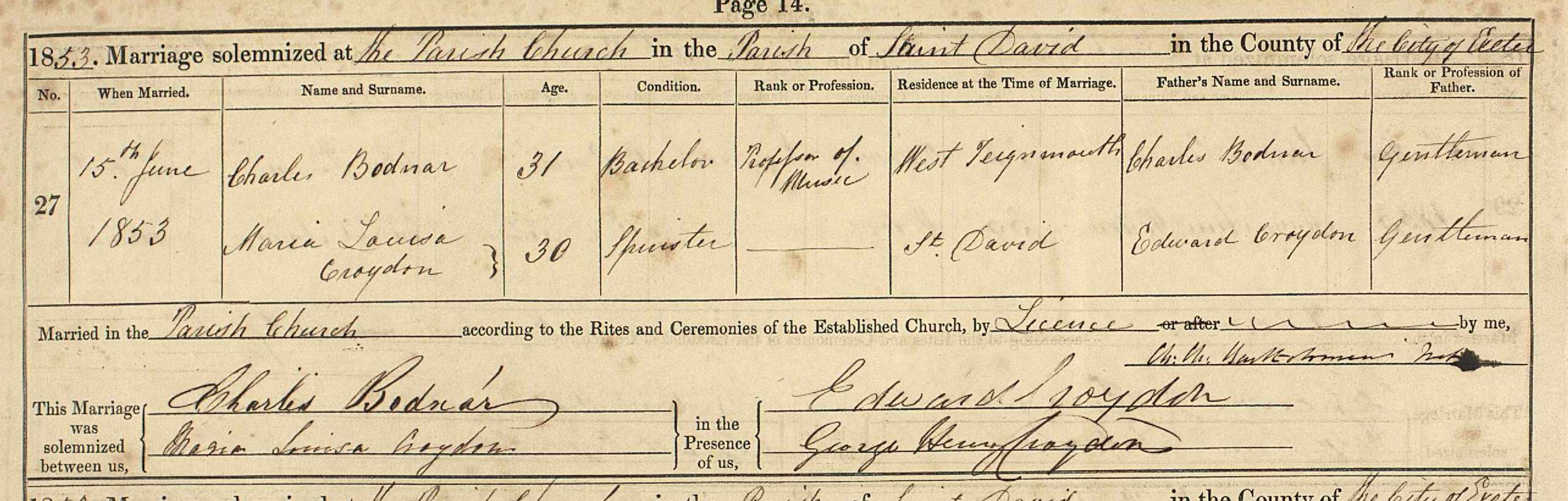 1. Charles Bodnar is shown as living in West Teignmouth whilst Maria Louisa’s residence is given as St Davids – the area of Exeter where Charles Bodnar used to live – which would explain why the marriage was held there and not in Teignmouth;