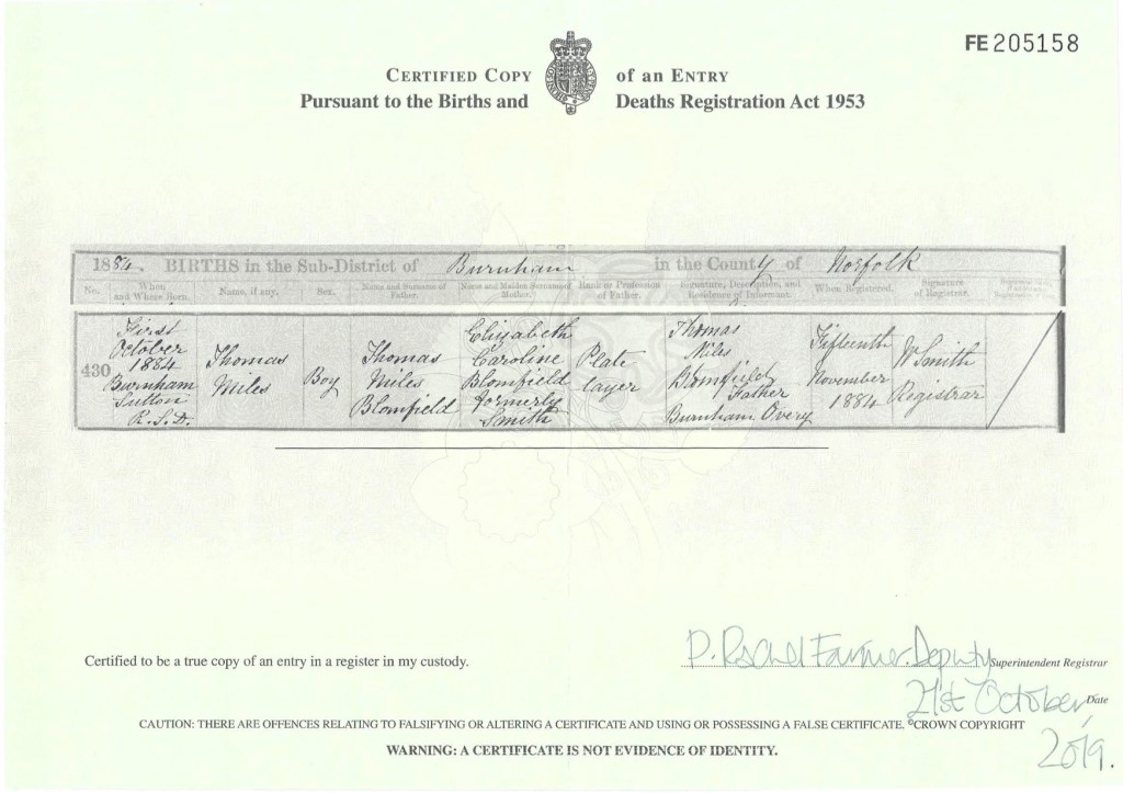 There is some confusion arising from Thomas Miles’s birth certificate contradicting all other known information about him. It records the family surname, including his, as Blomfield, his birth place as Burnham Overy, and his birthdate as 1st October 1884.