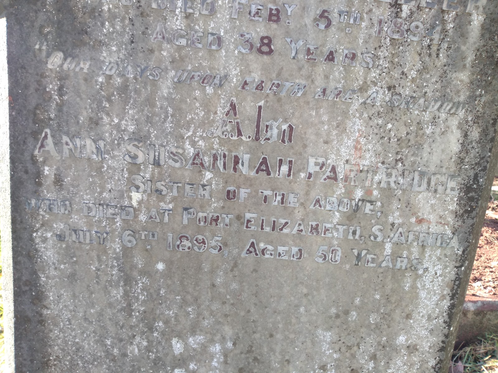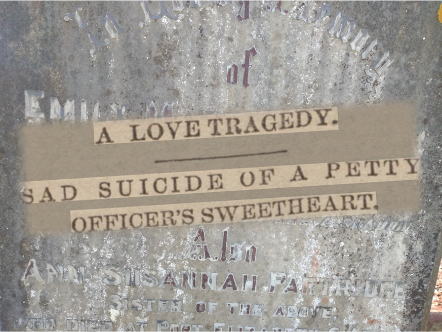 Emily is buried in Teignmouth Old Cemetery and we found her grave recently whilst clearing section N. The grave had been prepared for the interment of two people and the headstone does also commemorate her sister, Ann Susannah Partridge, who died the following year in Port Elizabeth, S. Africa. The burial records though do not show her buried here.