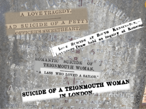 Her departure for London seemed to coincide with the death of her mother who had been committed to the ‘Devon County Lunatic Asylum’ in Exminster at least three years earlier and died there in the third quarter of 1884 (perhaps contradicting brother James’ assertion that there was no insanity in the family?). Her father died in 1892 and even though she seems to have returned to Teignmouth off and on it appears from her brother James’ statement that she was also in anguish about the disappearance from her life of the petty officer to whom she was engaged.