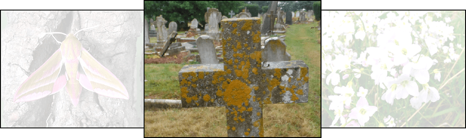 The following pages cover various areas in the cemetery showing the range of lichens that find a home here. Click on the link to go there directly:
