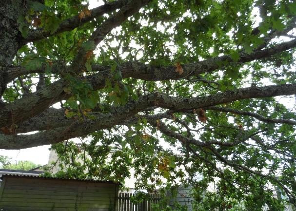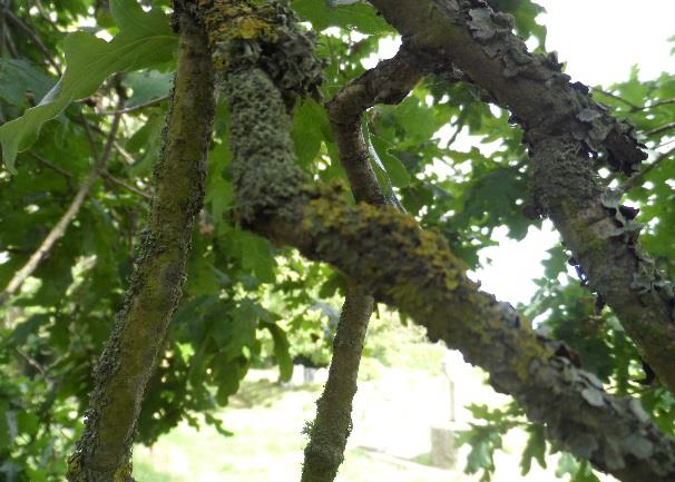 The trunk of this oak tree displays large rosettes of grey foliose lichens: Parmelia saxatilis and Flavoparmelia sp