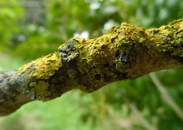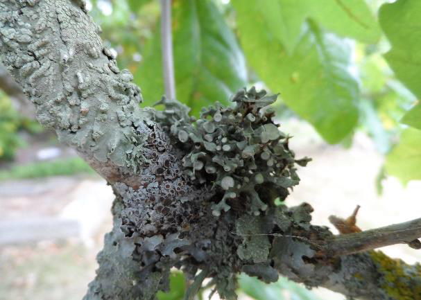 Lichens competing for space on the branch Look for the cup shaped fruiting bodies of Physcia aipola. They grow best in full sun.