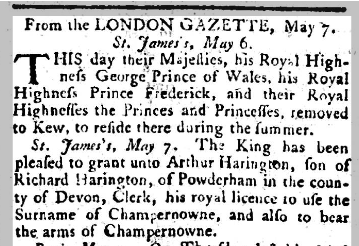 Even though Jane had died before Rawlin and Richard Harrington had also remarried before Rawlin’s death it was deemed that Arthur, barely seven years old, could become heir to the Dartington estate on condition that he changed his surname to Champernowne.[7] This required royal assent which was duly given as announced in the London Gazette[8]: