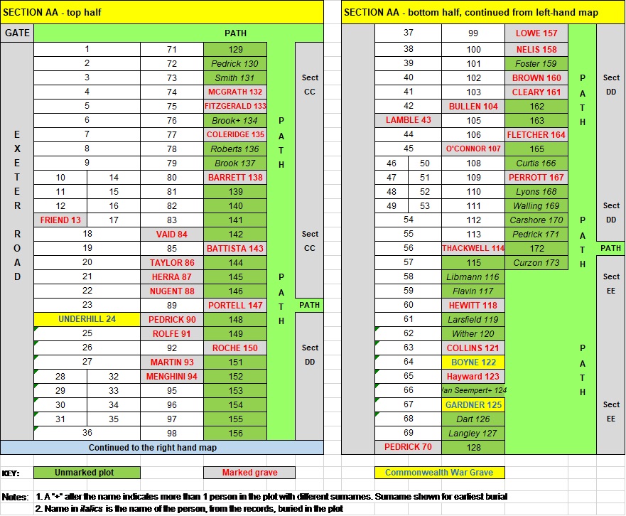 You can use the information on the plot map to triangulate on the grave you are looking for based on other graves you can find around the edges of the section. For example if you are looking for someone buried in AA14 you could look for the Barrett (plot 138) grave on the eastern edge of the section and then walk inwards to the second plot from there.