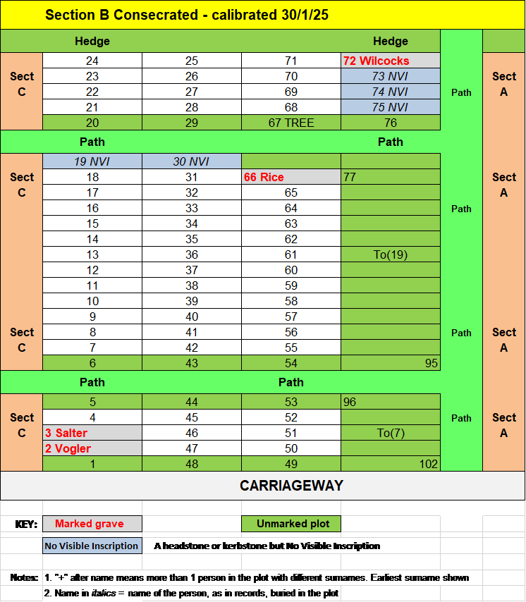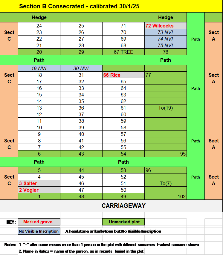 This section helps you locate where someone is buried if you already have a plot number for that person. The adjacent picture shows the layout of sections in the cemetery whilst the plot map below shows all the grave plots in section B (consecrated).