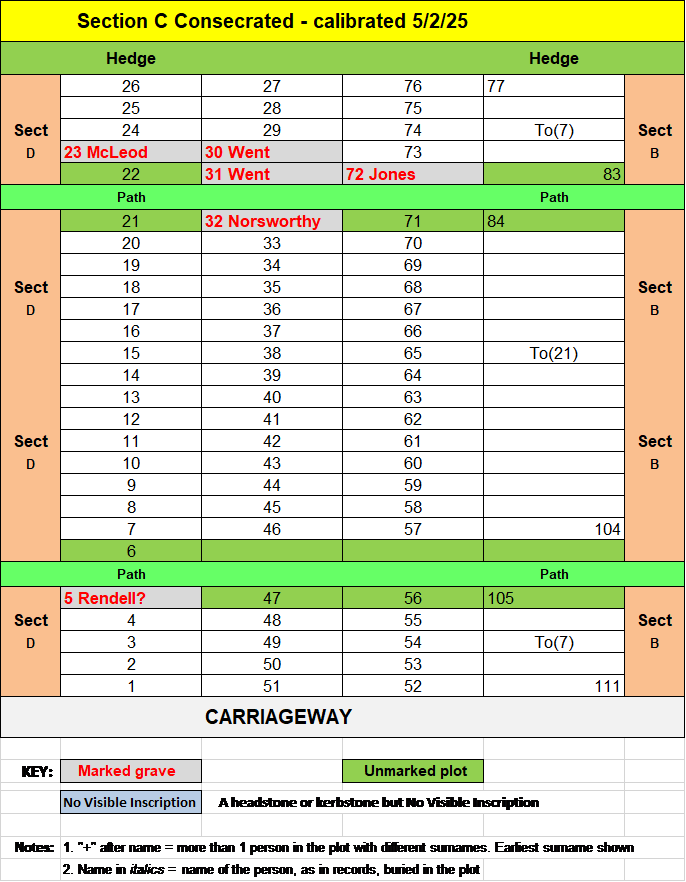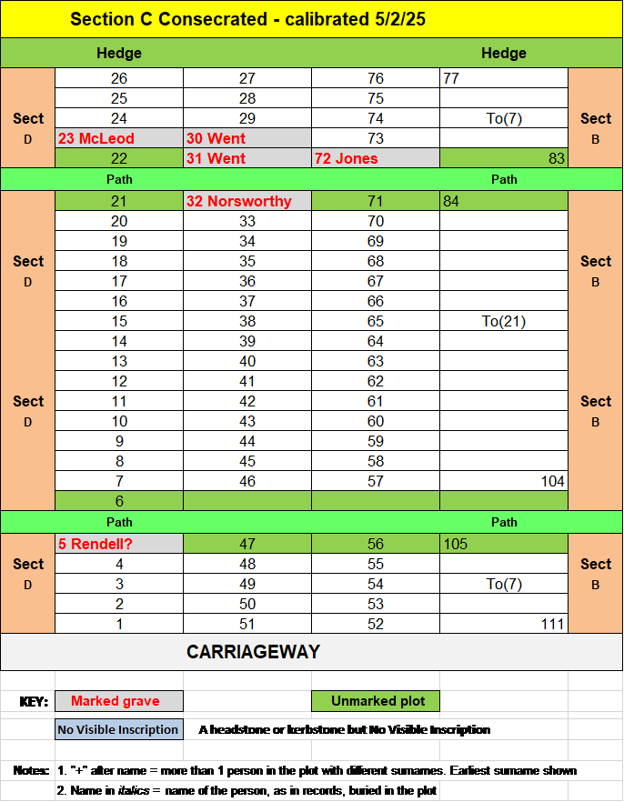 This section helps you locate where someone is buried if you already have a plot number for that person. The adjacent picture shows the layout of sections in the cemetery whilst the plot map below shows all the grave plots in section C (consecrated).