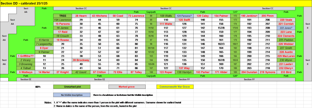 You can use the information on the plot map to triangulate on the grave you are looking for based on other graves you can find around the edges of the section. For example if you are looking for someone buried in DD045 you could look for the Parsons grave on the western edge of the section and then walk inwards to the second plot from there; or the Hitchens grave on the northern edge and walk down 2 plots .