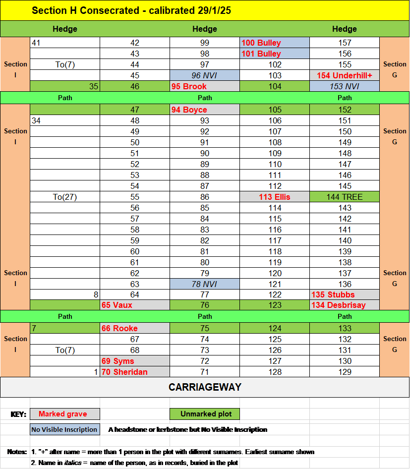 This section helps you locate where someone is buried if you already have a plot number for that person. The adjacent picture shows the layout of sections in the cemetery whilst the plot map below shows all the grave plots in section H (consecrated).