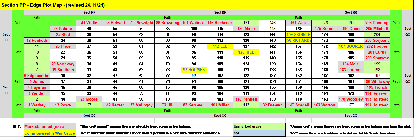 You can use the information on the plot map to triangulate on the grave you are looking for based on other graves you can find around the edges of the section. For example if you are looking for someone buried in PP047 you could look for the “Edgecombe” grave on the western edge of section PP and then walk inwards to the third grave from there, or “Hexter” on the southern edge and walk up to the fifth grave from there.