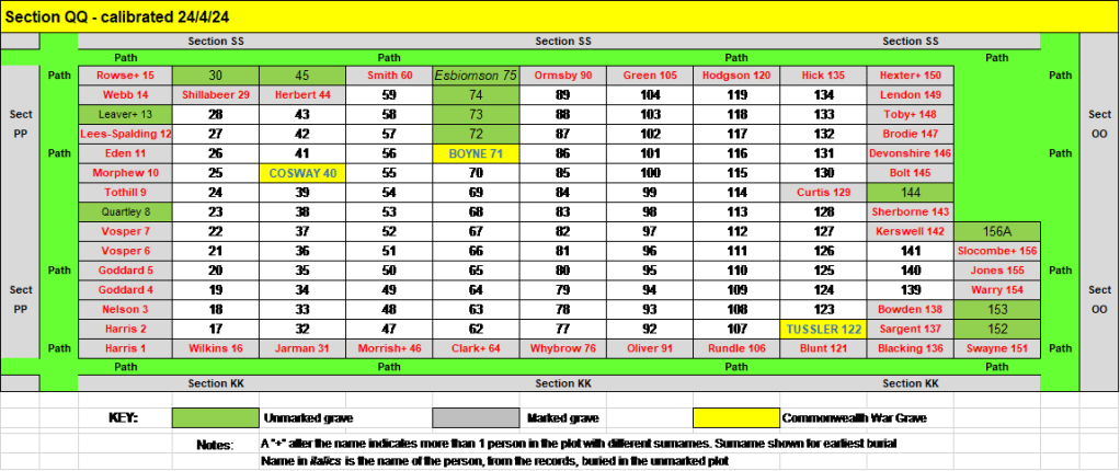 You can use the information on the plot map to triangulate on the grave you are looking for based on other graves you can find around the edges of the section. For example if you are looking for someone buried in QQ049 you could look for the Goddard grave on the western edge of the section and then walk inwards to the third grave from there; or the Morrish grave on the southern edge and walk up three graves.